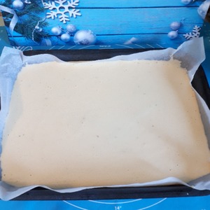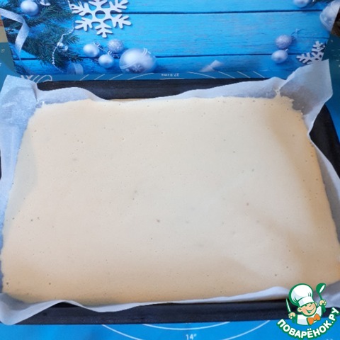 Противень застелить пергаментом, я использую силиконизированный, вылить тесто, равномерно распределить его по противню.