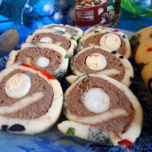 Вкусный закусочный рулет из куриной печени отлично будет смотреться на праздничном столе. Украсить такой рулет можно по своему вкусу и приготовить его не сложно.