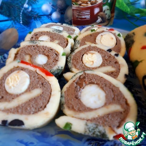 Намазать печеночную массу на яичный пласт, с одной стороны оставить примерно 2 см. С другой стороны положить друг за другом перепелинные яйца.