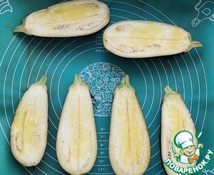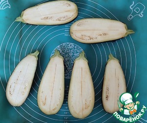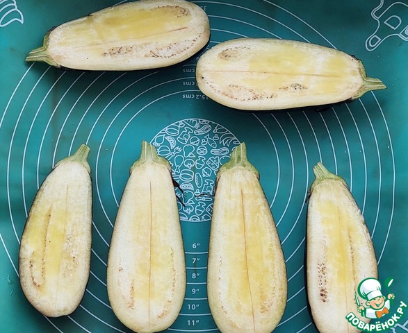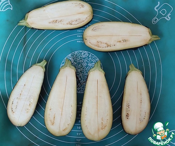 Баклажаны (у меня маленькие) помыть, разрезать пополам. На каждой половинке сделать надрез. Переложить на противень, застеленный силиконовым ковриком.