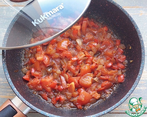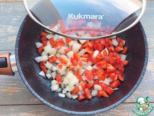 Пока запекаются баклажаны, приготовим соус. Лук репчатый почистить, помыть, нарезать кубиками. Болгарский перец помыть, очистить от семян, нарезать кубиками. Отправить овощи на смазанную растительным маслом сковороду ТМ KUKMARA с антипригарным покрытием Ultra granit.