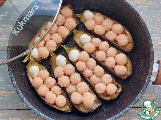 Влажными руками сформировать маленькие куриные шарики, заполнить ими баклажаны. Разложить шарики моцареллы, разрезанные пополам.