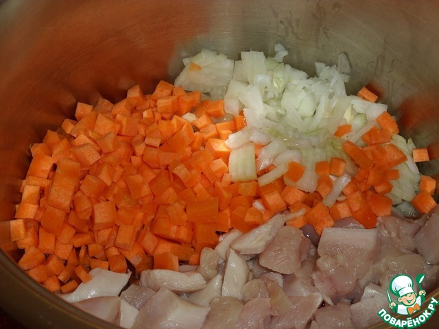 Мелко нарезаем лук. Морковь нарезаем мелким кубиком.