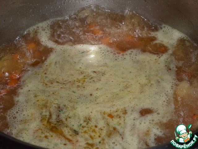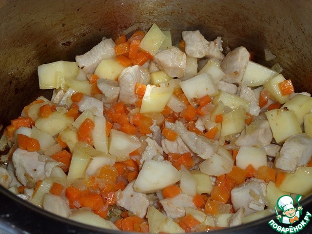 Затем выкладываем его в кастрюлю к мясу и овощам.