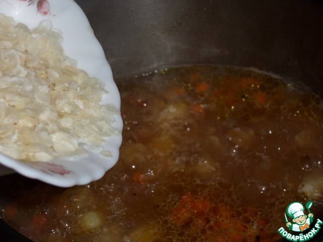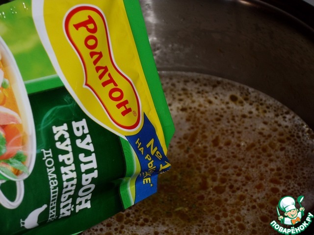 Добавляем в кастрюлю чистую воду и бульон ТМ" Роллтон".