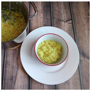 Рис готов. Вот такой яркий, пряный и красивый. Выложила на салат определённое количества риса в посуду, чтобы он остыл побыстрей. Кастрюля от Kukmara серии "Leon" держит тепло долго и рис в ней долго не остынет, а для салата нужен рис остывший. Оставшийся рис используем в качестве гарнира к чему-нибудь. Пока варится рис и остывает, нужно сварить яйца вкрутую и сделать майонез домашний.