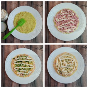 Всё у нас готово для салата. Нужно взять тарелку с углублением небольшим. В ней будет проще формировать рожицу. D- 20 см углубления (без бортов, с бортами тарелка D-24 см). Выкладываем салат слоями, каждый слой промазывая майонезом. Чтобы было проще промазывать слои, майонез переложите в пакет и сделайте конус, прессуя майонез, носик немного отрежьте у конуса (пакета), через который будите давить майонез.
