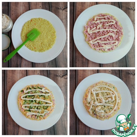 4 слой - мелко порезанный огурец или натёртый и отжатый от сока (я резала) + майонез