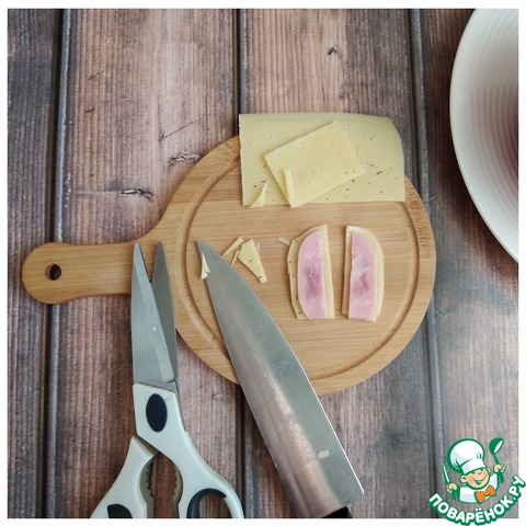 Делаем оформление для мордочки Кроля новогоднего. Уши из 2-х слоев - сырного и ветчинного (см. на фото). Из ветчины я сделала нос и рот, глаза - из кусочков белка с горошинами чёрного перца, усы - из сухих веточек укропа. Для вырезания я использовала кухонные ножницы, ими проще вырезать фигурки.