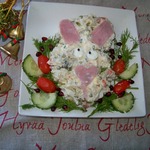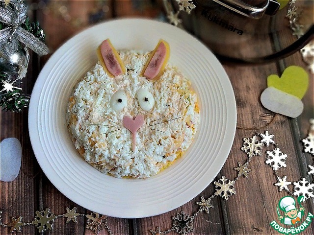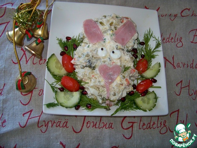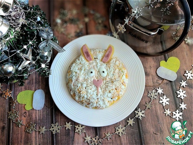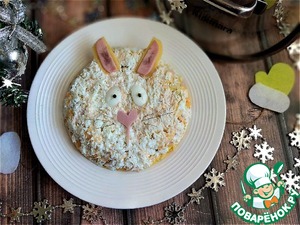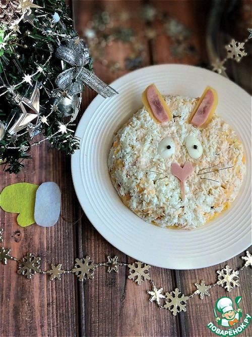 Салат с новогодним оформлением в виде мордочки кролика - символа года. Салат с рисом, ветчиной... и домашним майонезом. Мордочку выдумывала попроще, чтобы у желающих приготовить салат она получилась. По составу салат подойдёт на праздничный стол, он с насыщенным и ярким вкусом.