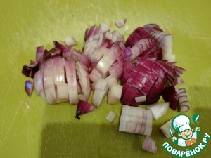 Лук режем небольшими кубиками. Я взял красный лук для улучшения внешнего вида готового салата, но можно взять и обычный репчатый.