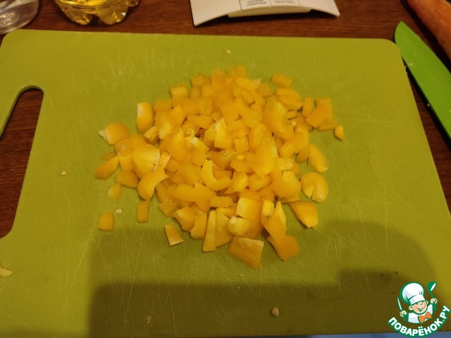 Я взял жёлтый перец для красивой цветовой гаммы. Если использовать обычный репчатый лук, то лучше добавить красный перец. -