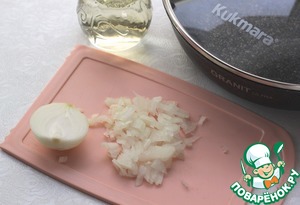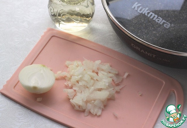 Мелко нарежьте лук и потушите до прозрачности на оливковом масле 3-4 мин. Я готовила на ап сковороде ТМ Kukmara Granit ultra, масла для этой сковороды понадобилось минимум.