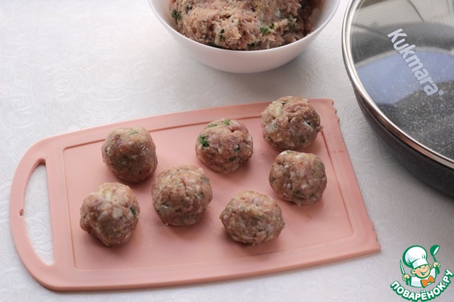 Мокрыми руками скатайте из фарша небольшого размера шарики, их должно получится 14-16 штук.