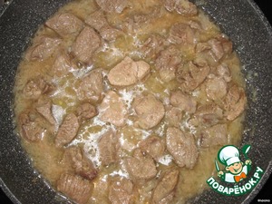 Затем добавляем мясо, перемешиваем, накрываем крышкой, делаем минимальный огонь и тушим до мягкости мяса. Примерно 1,5 часа. Может уйти и больше времени, все зависит от мяса. -