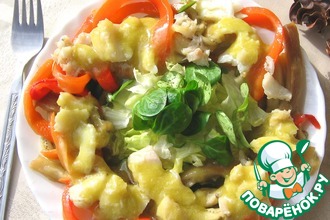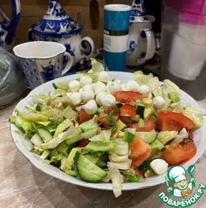 Зелень можно просто поломать/порвать в миску с ингредиентами. В конце добавляем маленькие шарики моцареллы. Я нашла такую моцареллу во вкус вилл. Мы можете приобрести более крупные варианты моцареллы, смотря на какую у вас есть возможность) -
