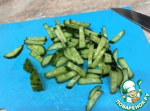 Нарезаем длинными дольками огурец. Режем квадратиками спелое авокадо.
