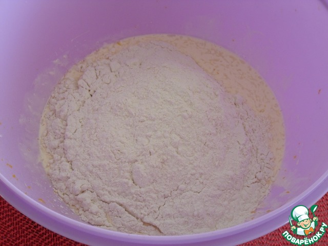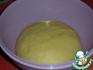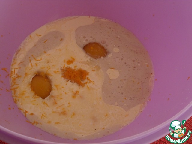 В глубокую миску выкладываем куриные яйца, растопленное остуженное сливочное масло, соль, ванилин и апельсиновую цедру. Добавляем молочно-дрожжевую смесь. Хорошо перемешиваем.