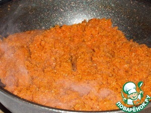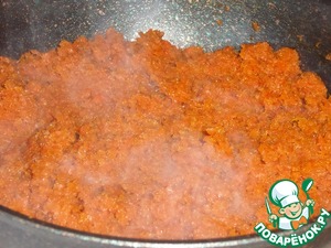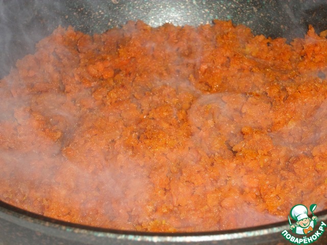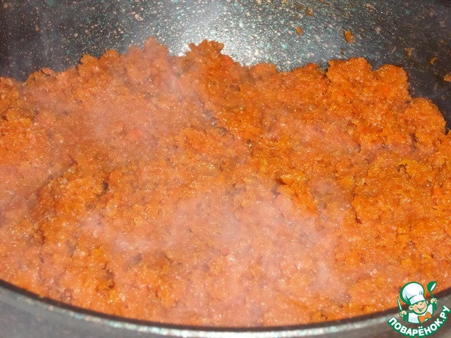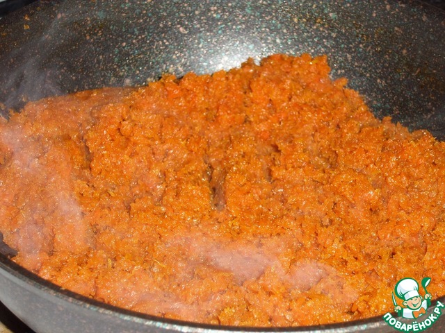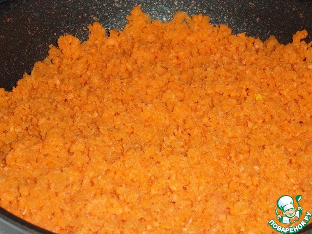 На огонь ставим глубокую толстостенную сковороду. Хорошо нагреваем. Выкладываем молотую морковь. Обжариваем, постоянно помешивая, в течении 10-12 минут.