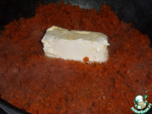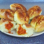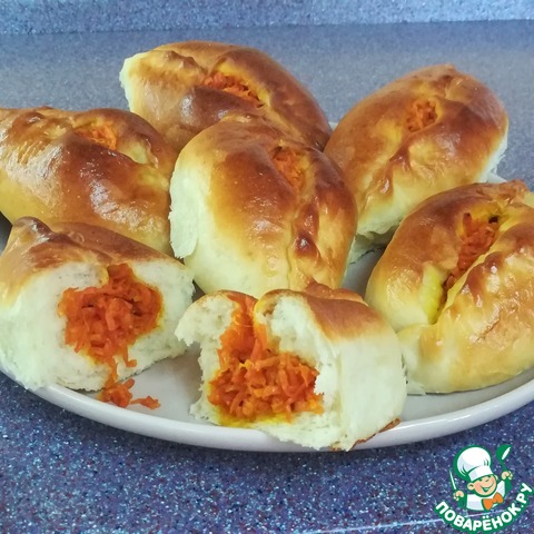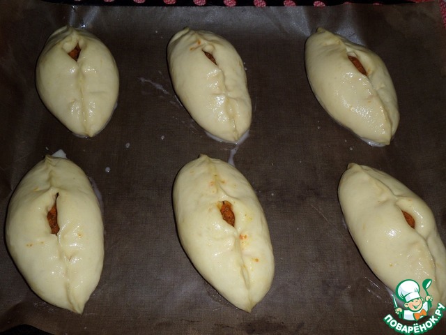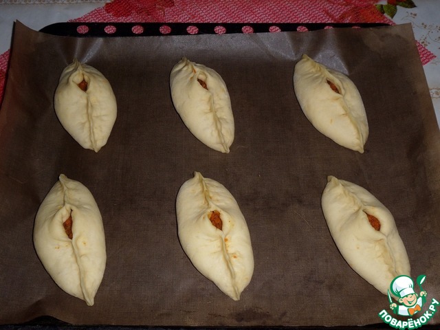 Раскатываем каждый кусочек теста в виде лепешки. На каждую лепешку выкладываем по 1 ст. л. с горкой ( примерно 35-38 гр.) морковной начинки.