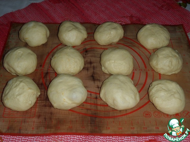 Тесто делим на равные кусочки. У меня 12 шт по 80 гр. Выкладываем их на рабочую поверхность, добавив немного муки.