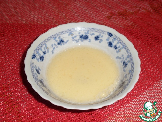 В миску разбиваем яйцо. Добавляем растительное масло и воду. Слегка взбиваем до однородности.