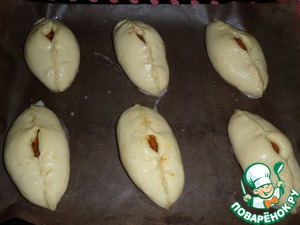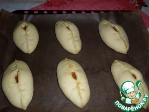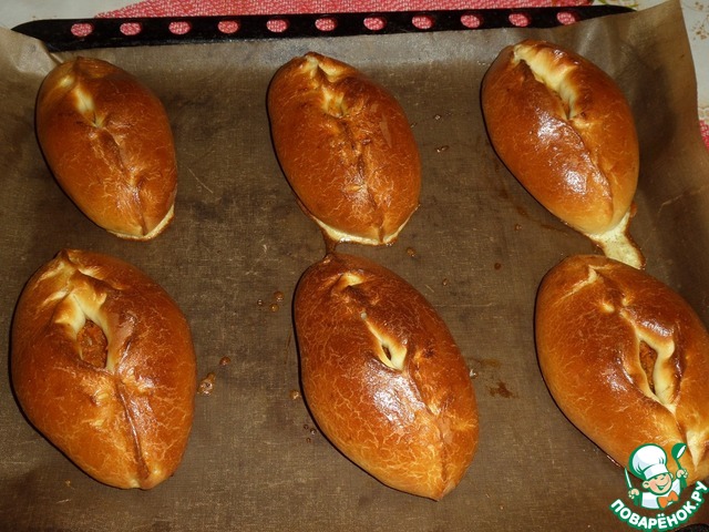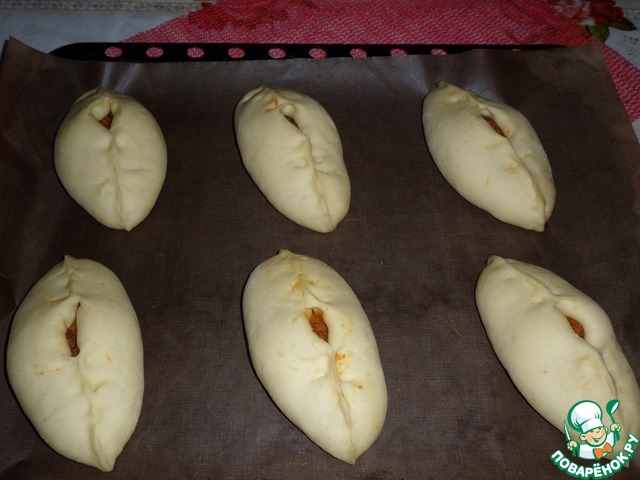 Выкладываем расстегаи на противень, застеленный ковриком для выпечки.