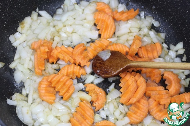 На этой же сковороде, после ребер, обжарить лук и морковь.