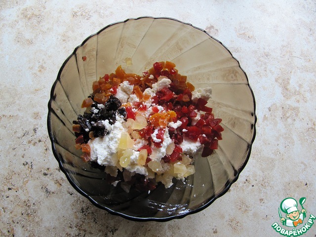 Для начинки смешать творог, вымытые и нарезанные небольшим кусочком сухофрукты, ванильный сахар. Добавление сахара - по вкусу!