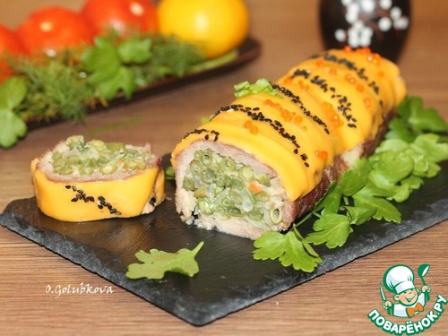 14. Заворачиваем мясо с начинкой в бумагу и при каждом обороте, подгибаем край бумаги внутрь, для того, чтобы не вытек сок.