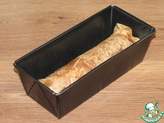 15. Кладем завернутое мясо в форму. Край пласта мясной колбаски (не бумаги), должен быть внизу. А края бумаги (по бокам) приподняты к верху. Запекайте в течение 30-35 минут в разогретой до 190 С духовке. Противень, я ставила немного ниже от середины духовки.