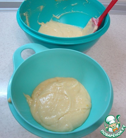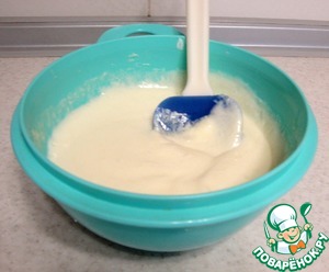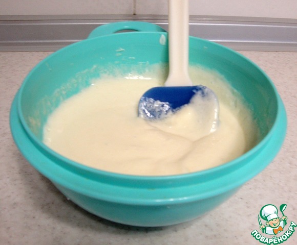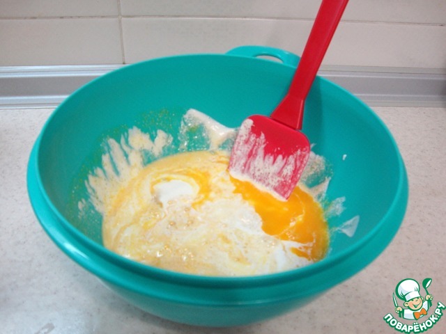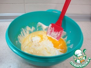 Тщательно растереть желтки с сахаром. Затем добавить сметану и постепенно всыпать муку с разрыхлителем. Хорошо размешать.