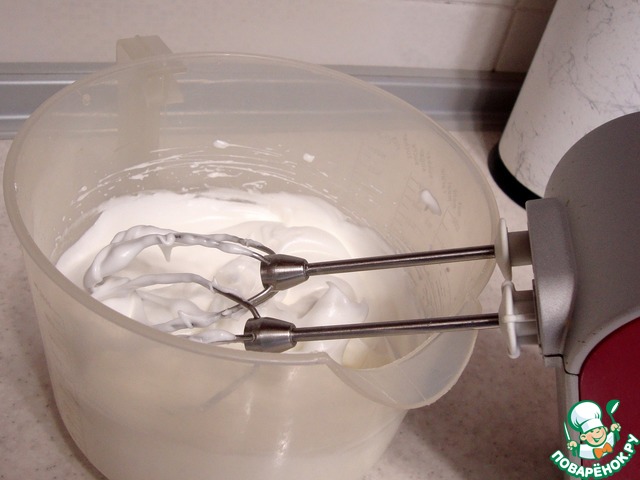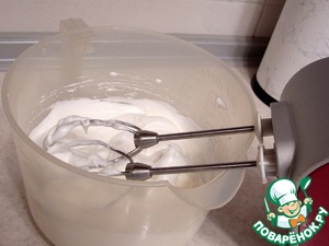 Холодные белки с небольшим количеством соли взбить в крутую пену, постепенно добавляя сахар, до стойких пиков.