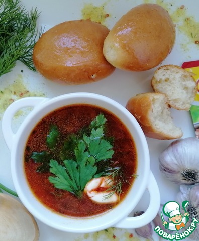 Какая еда без первого блюда. У нас на столе первое всегда присутствует. а из всех первых блюд я люблю борщ со свеклой. А к ним еще подать и пампушки с чесноком - вообще песня получается! Разбег по времени приготовления я поставила из расчета, на каком бульоне будет вариться борщ, если использовать мясо на кости, то время надо добавить на варку бульона. Но можно варить и постный борщ, тогда времени, соответственно, меньше уйдет на готовку))) Бульон "Ролтон". Я всегда добавляю его по вкусу, он придает блюду какой-то свой аромат и вкус!