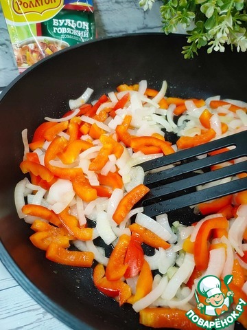 • На сковороде разогрейте 2 ст. л. растительного масла. Пассируйте лук и перец до лёгкой золотистости лука.