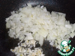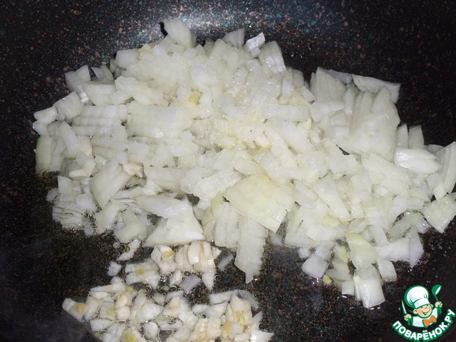 • Глубокую толстостенную сковороду хорошо разогреваем на огне. Добавляем растительное масло. Выкладываем лук, чеснок и сахар.