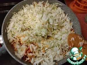 Наконец пришла очередь капусты. Вся капуста на сковороду сразу у вас не влезет, но она очень хорошо ужаривается, поэтому выкладываем пока только часть, чтобы удобно было мешать.