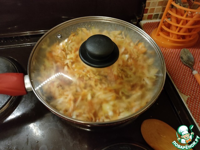Добавляем на сковороду оставшуюся капусту, перемешиваем и опять жарим под крышкой ещё 5-7 минут.