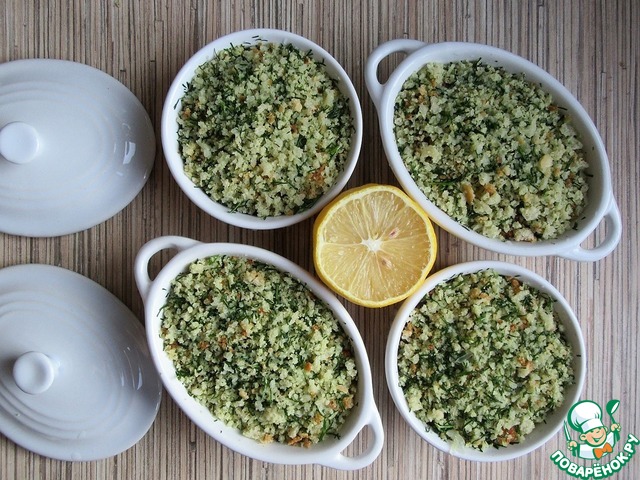Хлеб поломать на кусочки, выложить в чашу блендера, добавить веточки укропа, лимонный сок, черный перец, 0,5 ч. л. оставшегося бульона и растительное масло. Измельчить в крошку.