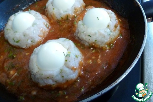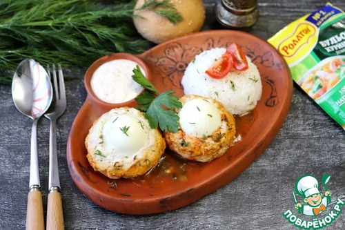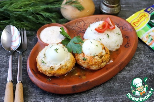 Сытные, вкусные и оригинальные на вид котлеты с яйцом для всей семьи. Вам только приготовить гарнир, а ароматный томатный соус с добавлением куриного домашнего бульона Роллтон готовится вместе с котлетами.