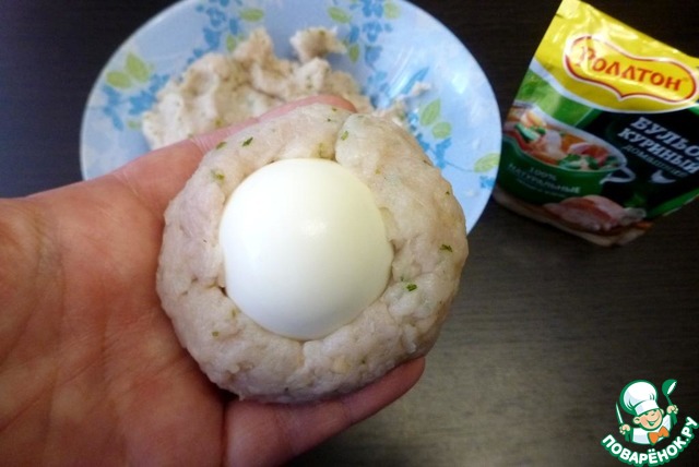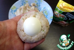 Вареные яйца разрезать поперёк на две части. Нужное для котлеты количество фарша скатать в лепешку, в середину поместить половину яйца белком вверх и облепить его фаршем до половины.