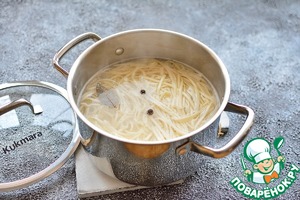 • Отварить лапшу в подсоленной воде с добавлением лавра и перца, в течении 6-8 минут. Промыть в дуршлаге, добавить чуть растительного масла, перемешать, вернуть в кастрюлю и закрыть крышкой.