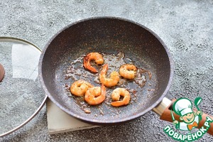 Очищенные креветки поджарить на чутке сливочного масла с обеих сторон.