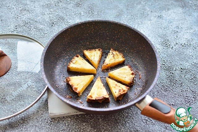 • Кругляш ананаса порезать на треугольнички и так же поджарить на чутке сливочного масла с обеих сторон.