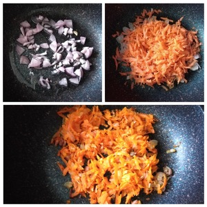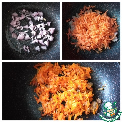 Пока остывает рыба, займёмся овощами. В сковороду наливаем масло подсолнечное, греем его и выкладываем порезанный произвольно лук, но не крупно. Я взяла лук шалот, он понежней. Можно использовать и репчатый или белый лук. Золотим его и добавляем натёртую на тёрке морковь. Я больше притомлю овощи до готовности на минимальном огне под крышкой. Снимаем с огня сковороду.