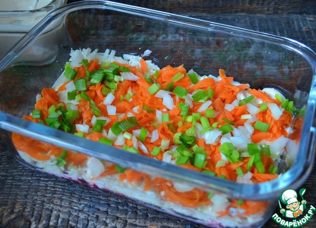 Следующий слой - пиала картофеля, вновь немного лука и майонез. Половину моркови, немного зелёного лука.
