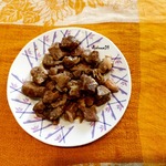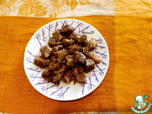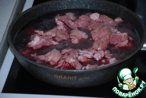 Нарезать мясо небольшими кусочками а-ля на гуляш. Выложить его в разогретую, смазанную растительным маслом сковороду. Готовить мне помогла моя новая помощница сковорода "Granit ultra". В ней очень равномерный нагрев и готовится все гораздо быстрее. Это очень легко и все получится даже у начинающей хозяйки.