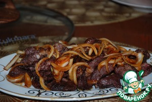 Перемешайте содержимое сковороды с маринованным луком и подавайте! Приятного Вам аппетита!