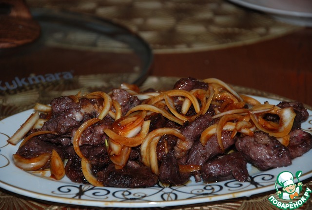 Очень вкусный и мега простой в приготовлении рецепт. Украсит любой праздничный стол. Вкусное, пропитанное вином мясо с маринованным лучком немного напоминает шашлык.