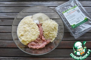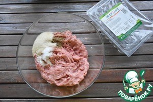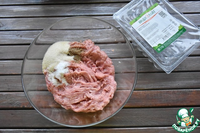 Фарш из индейки "Индилайт" перекладываю в миску. Добавляю панировочные сухари, соль, молотую смесь перцев.